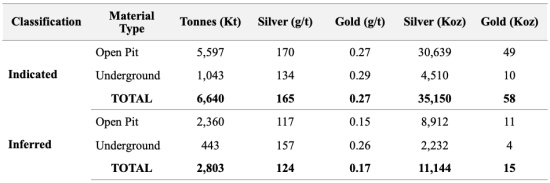 Table 1. Summary of the Mineral Resource Estimate for the Challacollo Silver-Gold Project